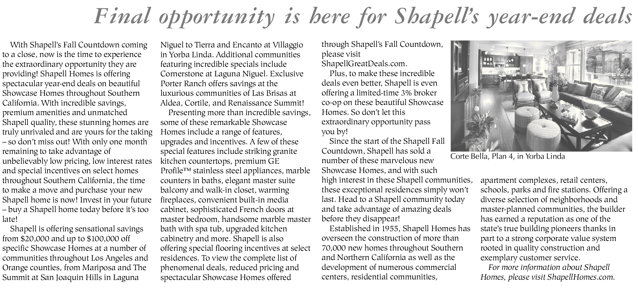 through Shapell’s Fall Countdown, please visit ShapellGreatDeals.com.