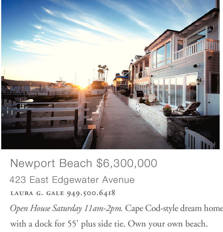 Newport Beach $6,300,000 423 East Edgewater Avenue laura g. gale 949.500.6418 Open House Saturday 11am-2pm. Cape Cod-style dream home with a dock for 55' plus side tie. Own your own beach.