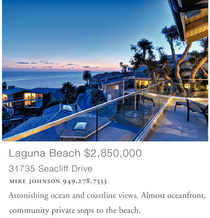 Laguna Beach $2,850,000 31735 Seacliff Drive mike johnson 949.278.7333 Astonishing ocean and coastline views. Almost oceanfront, community private steps to the beach.