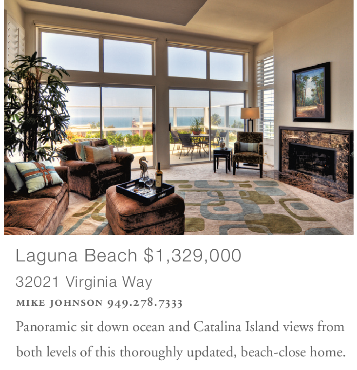 Laguna Beach $1,329,000 32021 Virginia Way mike johnson 949.278.7333 Panoramic sit down ocean and Catalina Island views from both levels of this thoroughly updated, beach-close home.