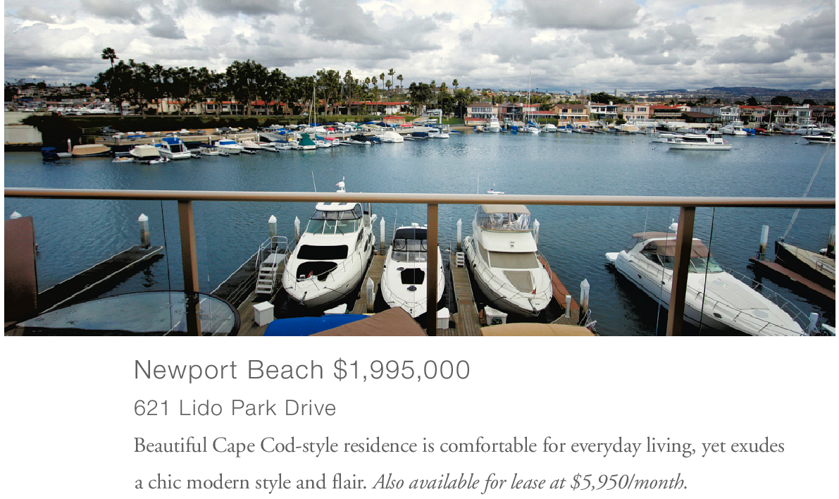 Newport Beach $1,995,000 621 Lido Park Drive Beautiful Cape Cod-style residence is comfortable for everyday living, yet exudes a chic modern style and flair. Also available for lease at $5,950/month.