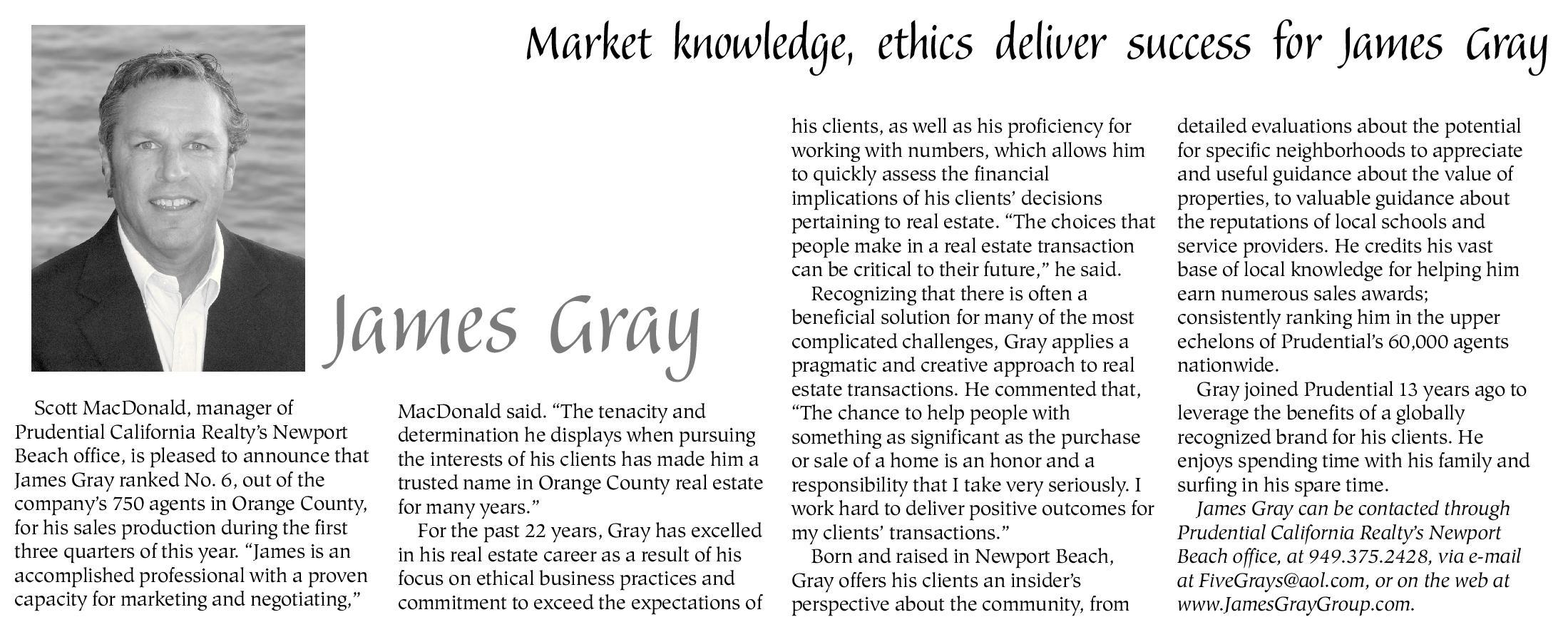 Scott MacDonald, manager of Prudential California Realty’s Newport Beach office, is pleased to announce that James Gray ranked No. 6, out of the company’s 750 agents in Orange County, for his sales production during the first three quarters of this year. “James is an accomplished professional with a proven capacity for marketing and negotiating,”