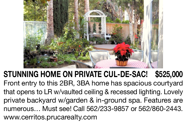 STUNNING HOME ON PRIVATE CUL-DE-SAC! $525,000 Front entry to this 2BR, 3BA home has spacious courtyard that opens to LR w/vaulted ceiling & recessed lighting. Lovely private backyard w/garden & in-ground spa. Features are numerous… Must see! Call 562/233-9857 or 562/860-2443. www.cerritos.prucarealty.com