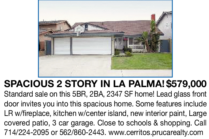 SPACIOUS 2 STORY IN LA PALMA! $579,000 Standard sale on this 5BR, 2BA, 2347 SF home! Lead glass front door invites you into this spacious home. Some features include LR w/fireplace, kitchen w/center island, new interior paint, Large covered patio, 3 car garage. Close to schools & shopping. Call 714/224-2095 or 562/860-2443. www.cerritos.prucarealty.com