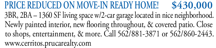 PRICE REDUCED ON MOVE-IN READY HOME! $430,000 3BR, 2BA – 1360 SF living space w/2-car garage located in nice neighborhood. Newly painted interior, new flooring throughout, & covered patio. Close to shops, entertainment, & more. Call 562/881-3871 or 562/860-2443. www.cerritos.prucarealty.com