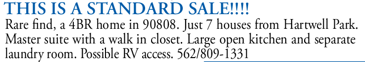Rare find, a 4BR home in 90808. Just 7 houses from Hartwell Park. Master suite with a walk in closet. Large open kitchen and separate laundry room. Possible RV access. 562/809-1331