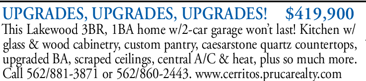 UPGRADES, UPGRADES, UPGRADES! $419,900 This Lakewood 3BR, 1BA home w/2-car garage won’t last! Kitchen w/ glass & wood cabinetry, custom pantry, caesarstone quartz countertops, upgraded BA, scraped ceilings, central A/C & heat, plus so much more. Call 562/881-3871 or 562/860-2443. www.cerritos.prucarealty.com