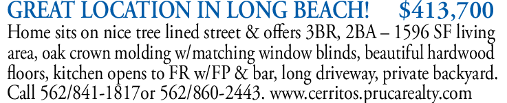 GREAT LOCATION IN LONG BEACH! $413,700 Home sits on nice tree lined street & offers 3BR, 2BA – 1596 SF living area, oak crown molding w/matching window blinds, beautiful hardwood floors, kitchen opens to FR w/FP & bar, long driveway, private backyard. Call 562/841-1817or 562/860-2443. www.cerritos.prucarealty.com