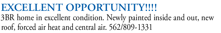 EXCELLENT OPPORTUNITY!!!! 3BR home in excellent condition. Newly painted inside and out, new roof, forced air heat and central air. 562/809-1331