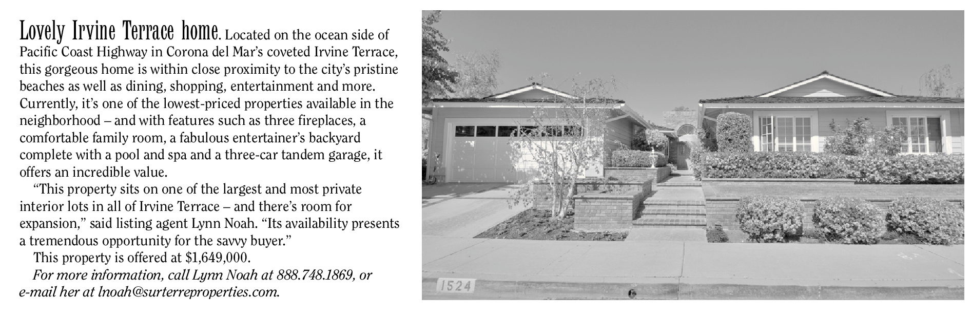 “This property sits on one of the largest and most private interior lots in all of Irvine Terrace – and there’s room for expansion,” said listing agent Lynn Noah. “Its availability presents a tremendous opportunity for the savvy buyer.”