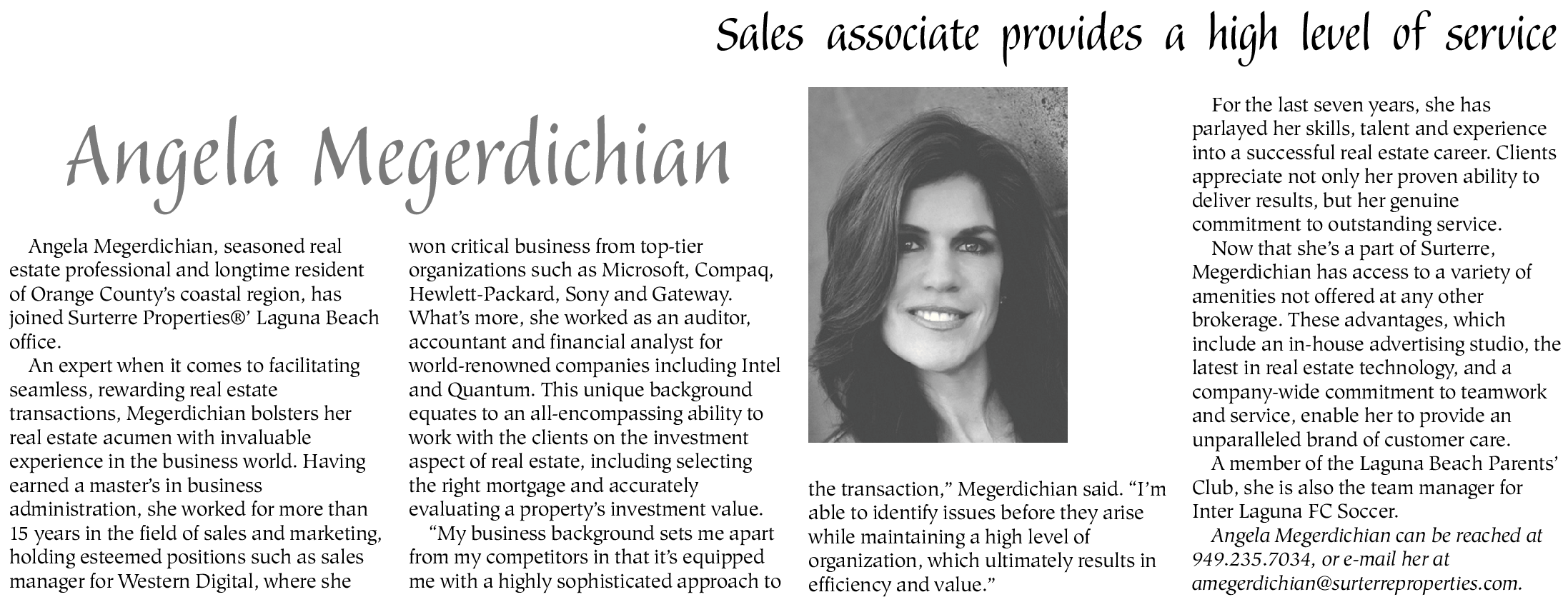 Angela Megerdichian can be reached at 949.235.7034, or e-mail her at amegerdichian@surterreproperties.com.