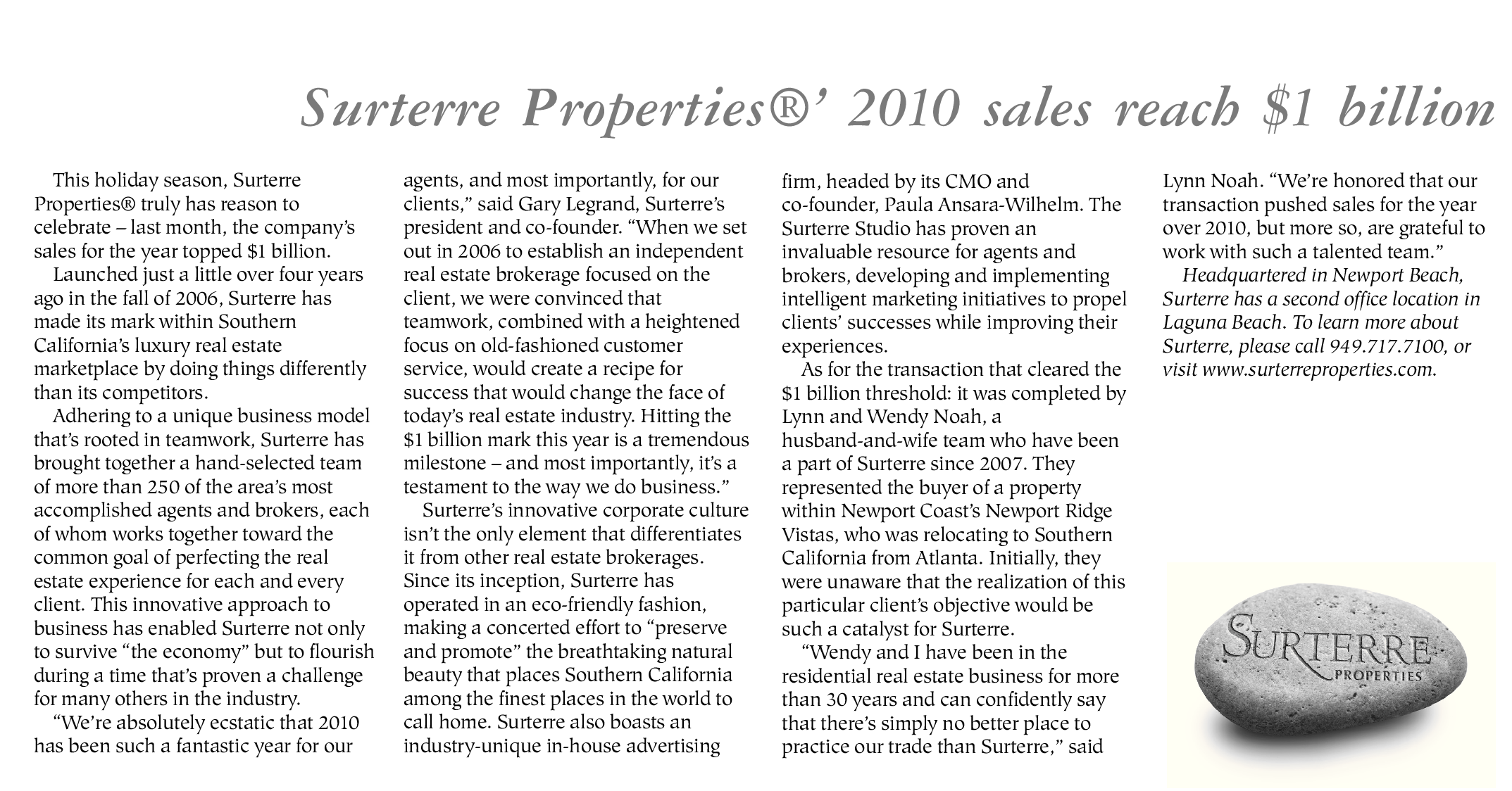 Surterre Properties®’ 2010 sales reach $1 billion