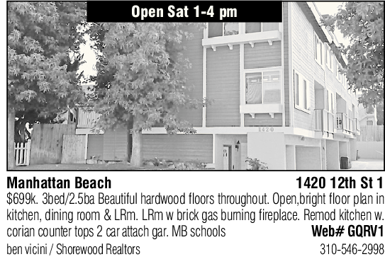 Manhattan Beach 1420 12th St 1 $699k. 3bed/2.5ba Beautiful hardwood floors throughout. Open,bright floor plan in kitchen, dining room & LRm. LRm w brick gas burning fireplace. Remod kitchen w. corian counter tops 2 car attach gar. MB schools Web# GQRV1 ben vicini / Shorewood Realtors 310-546-2998