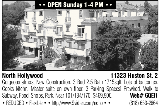 North Hollywood 11323 Huston St. 2 Gorgeous almost New Construction. 3 Bed 2.5 Bath 1715sqft. Lots of balconies. Cooks kitchn. Master suite on own floor. 3 Parking Spaces! Prewired. Walk to Subway, Food, Shops, Park. Near 101/134/170. $469,900. Web# GQEI1 • REDUCED • Flexible • • http://www.Svidler.com/noho • • (818) 653-2664