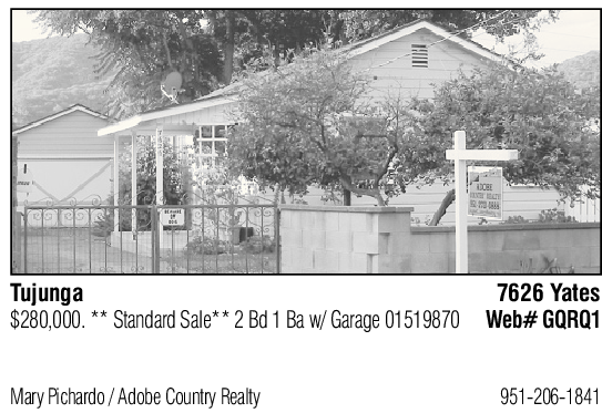 Tujunga 7626 Yates $280,000. ** Standard Sale** 2 Bd 1 Ba w/ Garage 01519870 Web# GQRQ1
