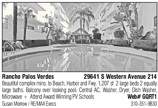 Rancho Palos Verdes 29641 S Western Avenue 214 Beautiful complex mins. to Beach, Harbor and Fwy. 1,207 sf 2 large beds 2 equally large baths. Balcony over looking pool. Central AC, Washer, Dryer, Dish Washer, Microwave + Attend Award Winning PV Schools Web# GQRT1 Susan Morrow / RE/MAX Execs 310-351-9830