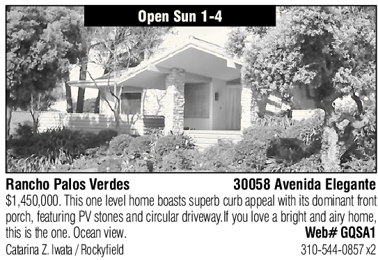 Rancho Palos Verdes 30058 Avenida Elegante $1,450,000. This one level home boasts superb curb appeal with its dominant front porch, featuring PV stones and circular driveway.If you love a bright and airy home, this is the one. Ocean view. Web# GQSA1 Catarina Z. Iwata / Rockyfield 310-544-0857 x2