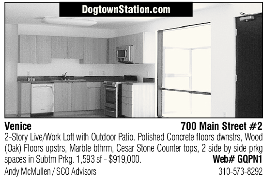 Venice 700 Main Street #2 2-Story Live/Work Loft with Outdoor Patio. Polished Concrete floors dwnstrs, Wood (Oak) Floors upstrs, Marble bthrm, Cesar Stone Counter tops, 2 side by side prkg spaces in Subtrn Prkg. 1,593 sf - $919,000. Web# GQPN1 Andy McMullen / SCO Advisors 310-573-8292