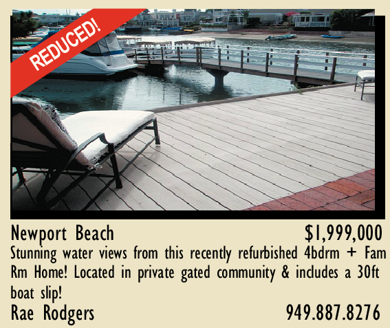 Newport Beach $1,999,000 Stunning water views from this recently refurbished 4bdrm + Fam Rm Home! Located in private gated community & includes a 30ft boat slip! Rae Rodgers 949.887.8276