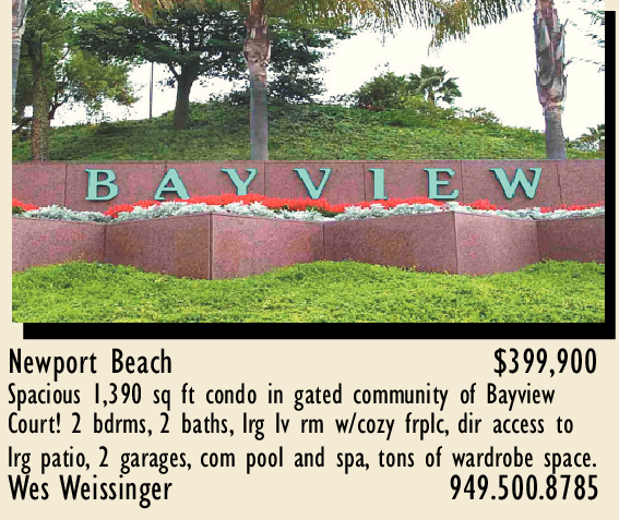 Newport Beach $399,900 Spacious 1,390 sq ft condo in gated community of Bayview Court! 2 bdrms, 2 baths, lrg lv rm w/cozy frplc, dir access to lrg patio, 2 garages, com pool and spa, tons of wardrobe space. Wes Weissinger 949.500.8785