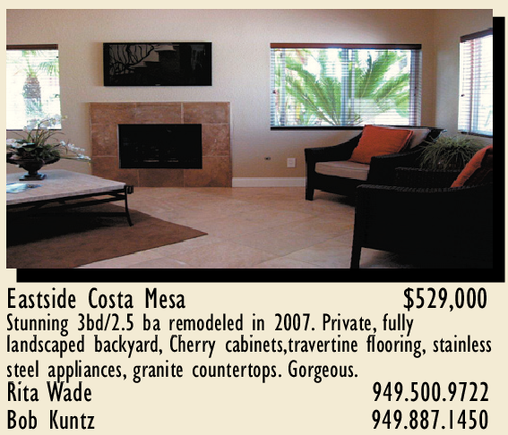 Eastside Costa Mesa $529,000 Stunning 3bd/2.5 ba remodeled in 2007. Private, fully landscaped backyard, Cherry cabinets,travertine flooring, stainless steel appliances, granite countertops. Gorgeous. Rita Wade 949.500.9722 Bob Kuntz 949.887.1450