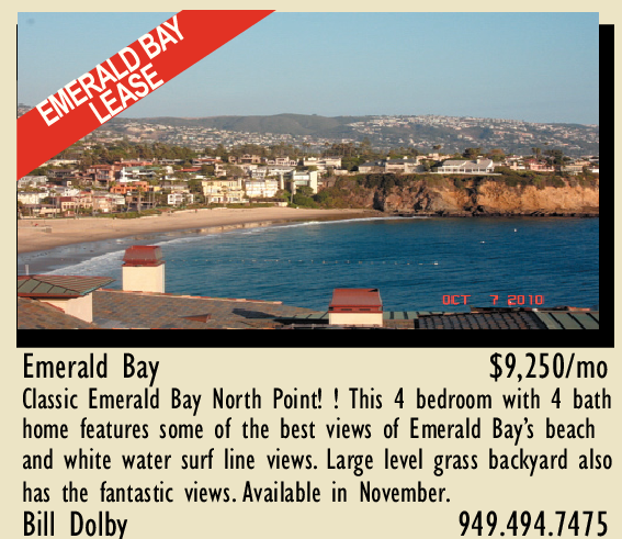 Emerald Bay $9,250/mo Classic Emerald Bay North Point! ! This 4 bedroom with 4 bath home features some of the best views of Emerald Bay’s beach and white water surf line views. Large level grass backyard also has the fantastic views.Available in November. Bill Dolby 949.494.7475