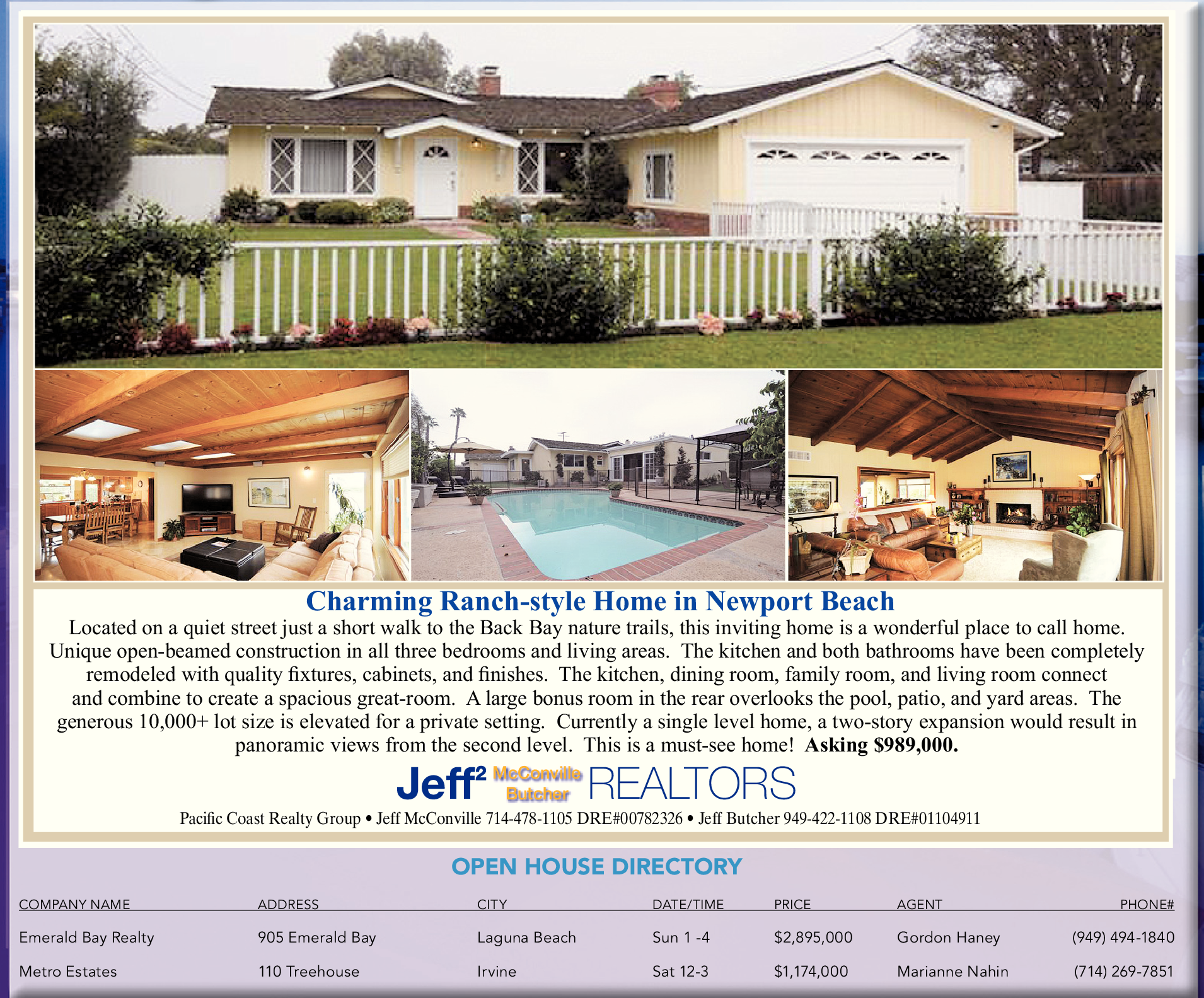Charming Ranch-style Home in Newport Beach Located on a quiet street just a short walk to the Back Bay nature trails, this inviting home is a wonderful place to call home. Unique open-beamed construction in all three bedrooms and living areas. The kitchen and both bathrooms have been completely remodeled with quality fixtures, cabinets, and finishes. The kitchen, dining room, family room, and living room connect and combine to create a spacious great-room. A large bonus room in the rear overlooks the pool, patio, and yard areas. The generous 10,000+ lot size is elevated for a private setting. Currently a single level home, a two-story expansion would result in panoramic views from the second level. This is a must-see home! Asking $989,000. OPEN HOUSE DIRECTORY COMPANY NAME ADDRESS CITY DATE/TIME PRICE AGENT PHONE# Emerald Bay Realty 905 Emerald Bay Laguna Beach Sun 1 -4 $2,895,000 Gordon Haney (949) 494-1840 Metro Estates 110 Treehouse Irvine Sat 12-3 $1,174,000 Marianne Nahin (714) 269-7851 Jeff 2 McConville Butcher REALTORS Pacific Coast Realty Group • Jeff McConville 714-478-1105 DRE#00782326 • Jeff Butcher 949-422-1108 DRE#01104911