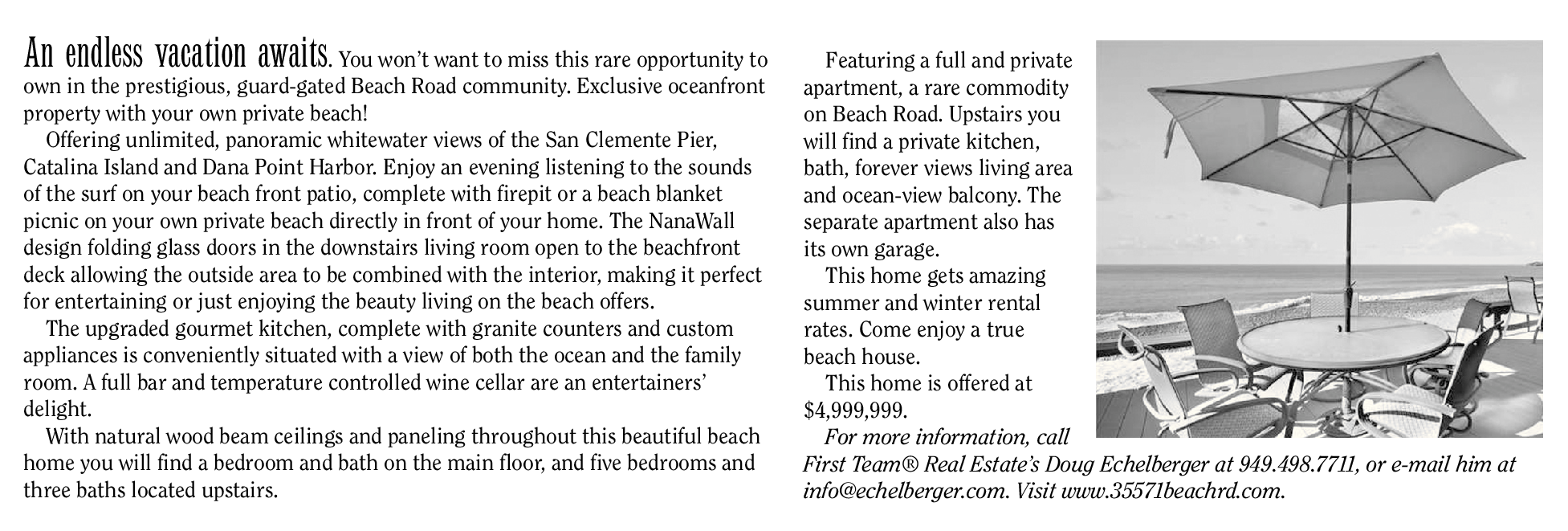 For more information, call First Team® Real Estate’s Doug Echelberger at 949.498.7711, or e-mail him at info@echelberger.com. Visit www.35571beachrd.com.