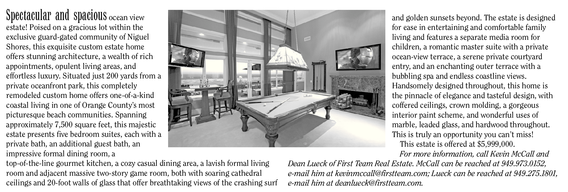 Spectacular and spacious ocean view estate! Poised on a gracious lot within the exclusive guard-gated community of Niguel Shores, this exquisite custom estate home offers stunning architecture, a wealth of rich appointments, opulent living areas, and effortless luxury. Situated just 200 yards from a private oceanfront park, this completely remodeled custom home offers one-of-a-kind coastal living in one of Orange County’s most picturesque beach communities. Spanning approximately 7,500 square feet, this majestic estate presents five bedroom suites, each with a private bath, an additional guest bath, an impressive formal dining room, a top-of-the-line gourmet kitchen, a cozy casual dining area, a lavish formal living room and adjacent massive two-story game room, both with soaring cathedral ceilings and 20-foot walls of glass that offer breathtaking views of the crashing surf and golden sunsets beyond. The estate is designed for ease in entertaining and comfortable family living and features a separate media room for children, a romantic master suite with a private ocean-view terrace, a serene private courtyard entry, and an enchanting outer terrace with a bubbling spa and endless coastline views. Handsomely designed throughout, this home is the pinnacle of elegance and tasteful design, with coffered ceilings, crown molding, a gorgeous interior paint scheme, and wonderful uses of marble, leaded glass, and hardwood throughout. This is truly an opportunity you can’t miss! This estate is offered at $5,999,000. For more information, call Kevin McCall and Dean Lueck of First Team Real Estate. McCall can be reached at 949.973.0152, e-mail him at kevinmccall@firstteam.com; Lueck can be reached at 949.275.1801, e-mail him at deanlueck@firstteam.com.