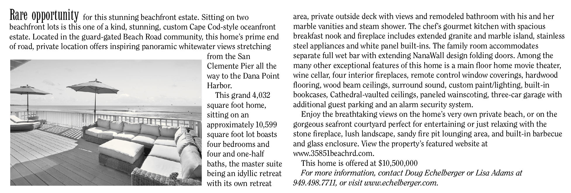 This home is offered at $10,500,000 For more information, contact Doug Echelberger or Lisa Adams at 949.498.7711, or visit www.echelberger.com.