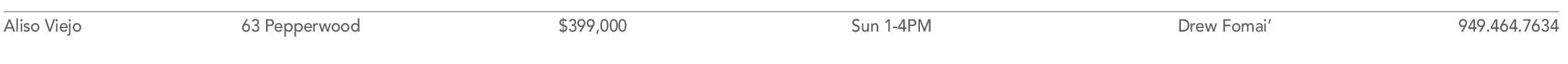 Aliso Viejo 63 Pepperwood $399,000 Sun 1-4PM Drew Fomai’ 949.464.7634