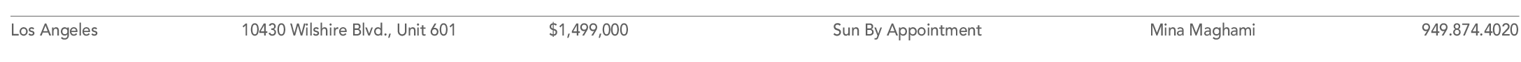 Los Angeles 10430 Wilshire Blvd., Unit 601 $1,499,000 Sun By Appointment Mina Maghami 949.874.4020
