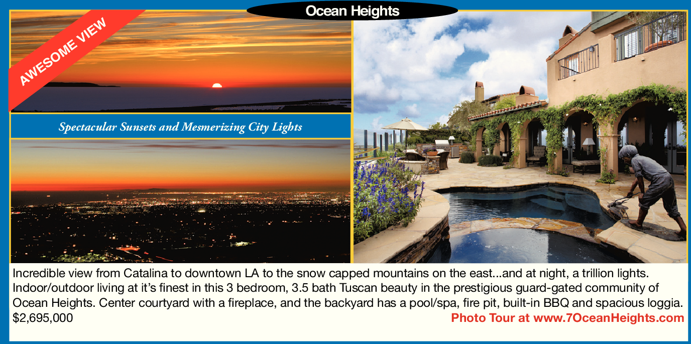 Incredible view from Catalina to downtown LA to the snow capped mountains on the east...and at night, a trillion lights. Indoor/outdoor living at it’s finest in this 3 bedroom, 3.5 bath Tuscan beauty in the prestigious guard-gated community of Ocean Heights. Center courtyard with a fireplace, and the backyard has a pool/spa, fire pit, built-in BBQ and spacious loggia. $2,695,000 Photo Tour at www.7OceanHeights.com