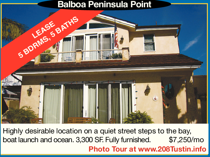 Highly desirable location on a quiet street steps to the bay, boat launch and ocean. 3,300 SF. Fully furnished. $7,250/mo Photo Tour at www.208Tustin.info