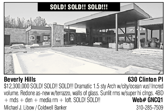 Beverly Hills 630 Clinton Pl $12,300,000 SOLD! SOLD!! SOLD!!! Dramatic 1.5 sty Arch w/city/ocean vus! Incred volume. Redone as-new w/terrazzo, walls of glass. Sunlit rms w/super hi clngs. 4BD + mds + den + media rm + loft. SOLD! SOLD!! Web# GNCQ1 Michael J. Libow / Coldwell Banker 310-285-7509