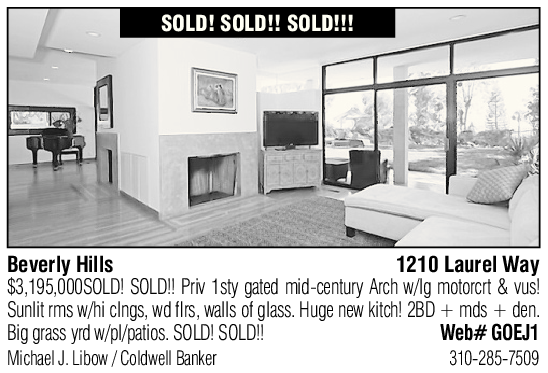 Beverly Hills 1210 Laurel Way $3,195,000SOLD! SOLD!! Priv 1sty gated mid-century Arch w/lg motorcrt & vus! Sunlit rms w/hi clngs, wd flrs, walls of glass. Huge new kitch! 2BD + mds + den. Big grass yrd w/pl/patios. SOLD! SOLD!! Web# GOEJ1 Michael J. Libow / Coldwell Banker 310-285-7509