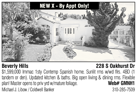 Beverly Hills 228 S Oakhurst Dr $1,599,000 Immac 1sty Contemp Spanish home. Sunlit rms w/wd flrs. 4BD (1 tandem or den). Updated kitchen & baths. Big open living & dining rms. Flexible plan! Master opens to priv yrd w/mature foliage. Web# GMNH1 Michael J. Libow / Coldwell Banker 310-285-7509