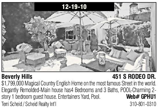 Beverly Hills 451 S RODEO DR. $1,799,000 Magical Country English Home on the most famous Street in the world. Elegantly Remolded-Main house has4 Bedrooms and 3 Baths, POOL-Charming 2- story 1 bedroom guest house. Entertainers Yard, Pool. Web# GPHU1 Terri Scheid / Scheid Realty Int’l 310-801-0310