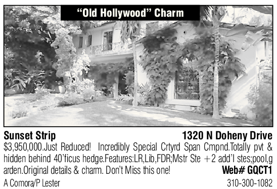 “Old Hollywood” Charm Sunset Strip 1320 N Doheny Drive $3,950,000.Just Reduced! Incredibly Special Crtyrd Span Cmpnd.Totally pvt & hidden behind 40’ficus hedge.Features:LR,Lib,FDR;Mstr Ste +2 add’l stes;pool,g arden.Original details & charm. Don’t Miss this one! Web# GQCT1 A Comora/P Lester 310-300-1082