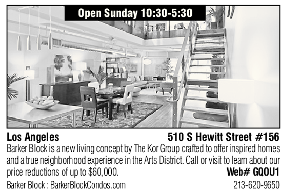 Los Angeles 510 S Hewitt Street #156 Barker Block is a new living concept by The Kor Group crafted to offer inspired homes and a true neighborhood experience in the Arts District. Call or visit to learn about our price reductions of up to $60,000. Web# GQOU1 Barker Block : BarkerBlockCondos.com 213-620-9650