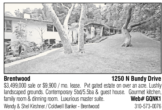 Brentwood 1250 N Bundy Drive $3,499,000 sale or $9,900 / mo. lease. Pvt gated estate on over an acre. Lushly landscaped grounds. Contemporary 5bd/5.5ba & guest house. Gourmet kitchen, family room & dinning room. Luxurious master suite. Web# GQNK1 Wendy & Shel Kirshner / Coldwell Banker - Brentwood 310-573-0076