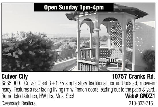 Open Sunday 1pm-4pm Culver City 10757 Cranks Rd. $885,000. Culver Crest 3+1.75 single story traditional home. Updated, move-in ready. Features a rear facing living rm w French doors leading out to the patio & yard. Remodeled kitchen, HW flrs, Must See! Web# GMXZ1 Cavanaugh Realtors 310-837-7161
