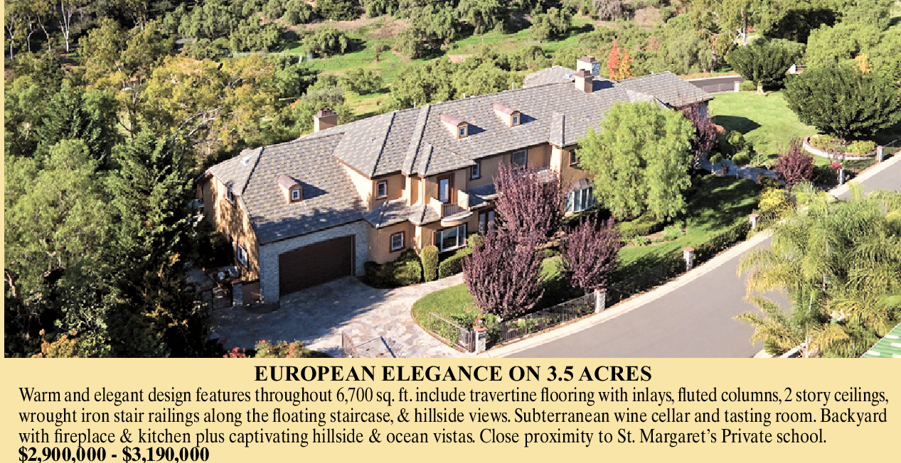 EUROPEAN ELEGANCE ON 3.5 ACRES Warm and elegant design features throughout 6,700 sq. ft. include travertine flooring with inlays, fluted columns, 2 story ceilings, wrought iron stair railings along the floating staircase, & hillside views. Subterranean wine cellar and tasting room. Backyard with fireplace & kitchen plus captivating hillside & ocean vistas. Close proximity to St. Margaret’s Private school. $2,900,000 - $3,190,000