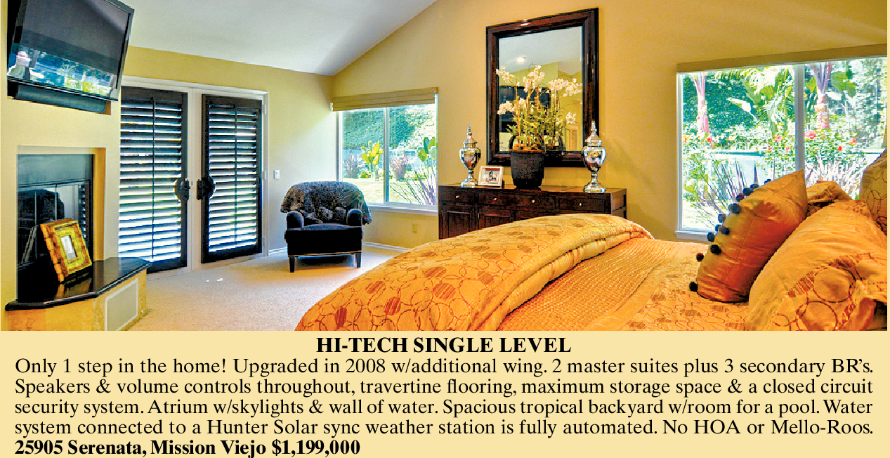 HI-TECH SINGLE LEVEL Only 1 step in the home! Upgraded in 2008 w/additional wing. 2 master suites plus 3 secondary BR’s. Speakers & volume controls throughout, travertine flooring, maximum storage space & a closed circuit security system.Atrium w/skylights & wall of water. Spacious tropical backyard w/room for a pool.Water system connected to a Hunter Solar sync weather station is fully automated. No HOA or Mello-Roos. 25905 Serenata, Mission Viejo $1,199,000