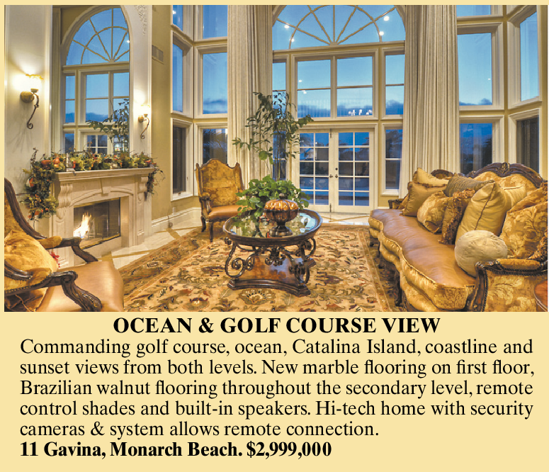 OCEAN & GOLF COURSE VIEW Commanding golf course, ocean, Catalina Island, coastline and sunset views from both levels. New marble flooring on first floor, Brazilian walnut flooring throughout the secondary level, remote control shades and built-in speakers. Hi-tech home with security cameras & system allows remote connection. 11 Gavina, Monarch Beach. $2,999,000