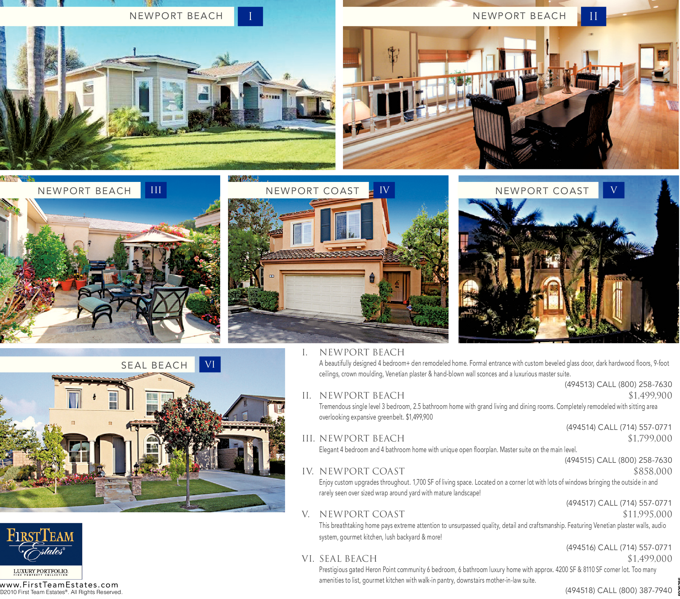 (494513) CALL (800) 258-7630 II. NEWPORT BEACH $1,499,900 Tremendous single level 3 bedroom, 2.5 bathroom home with grand living and dining rooms. Completely remodeled with sitting area overlooking expansive greenbelt. $1,499,900 (494514) CALL (714) 557-0771 III. NEWPORT BEACH $1,799,000 Elegant 4 bedroom and 4 bathroom home with unique open floorplan. Master suite on the main level.