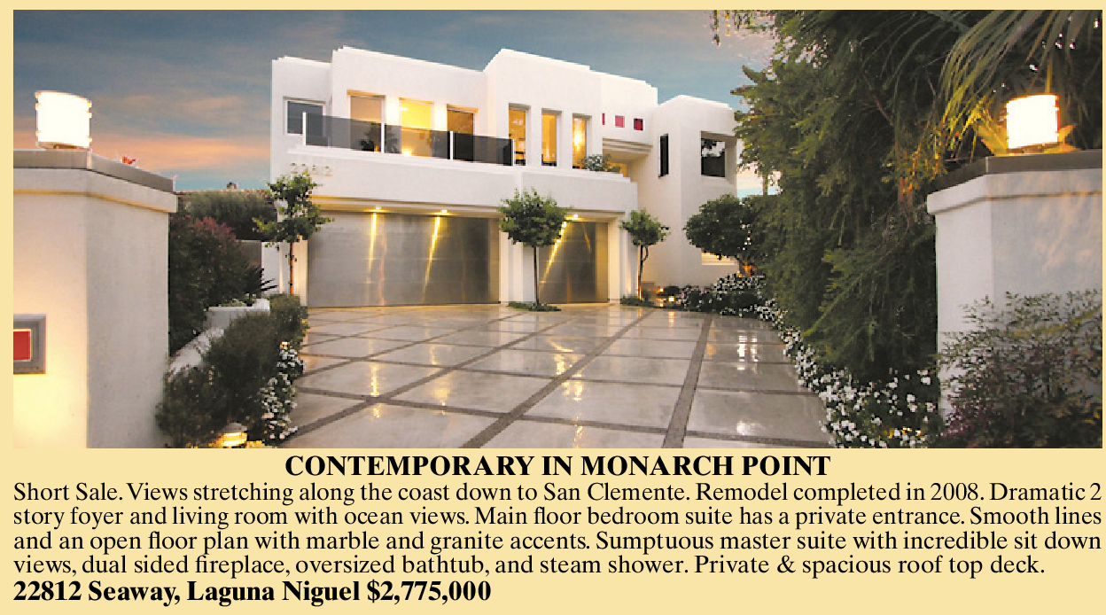 CONTEMPORARY IN MONARCH POINT Short Sale.Views stretching along the coast down to San Clemente. Remodel completed in 2008. Dramatic 2 story foyer and living room with ocean views. Main floor bedroom suite has a private entrance. Smooth lines and an open floor plan with marble and granite accents. Sumptuous master suite with incredible sit down views, dual sided fireplace, oversized bathtub, and steam shower. Private & spacious roof top deck. 22812 Seaway, Laguna Niguel $2,775,000