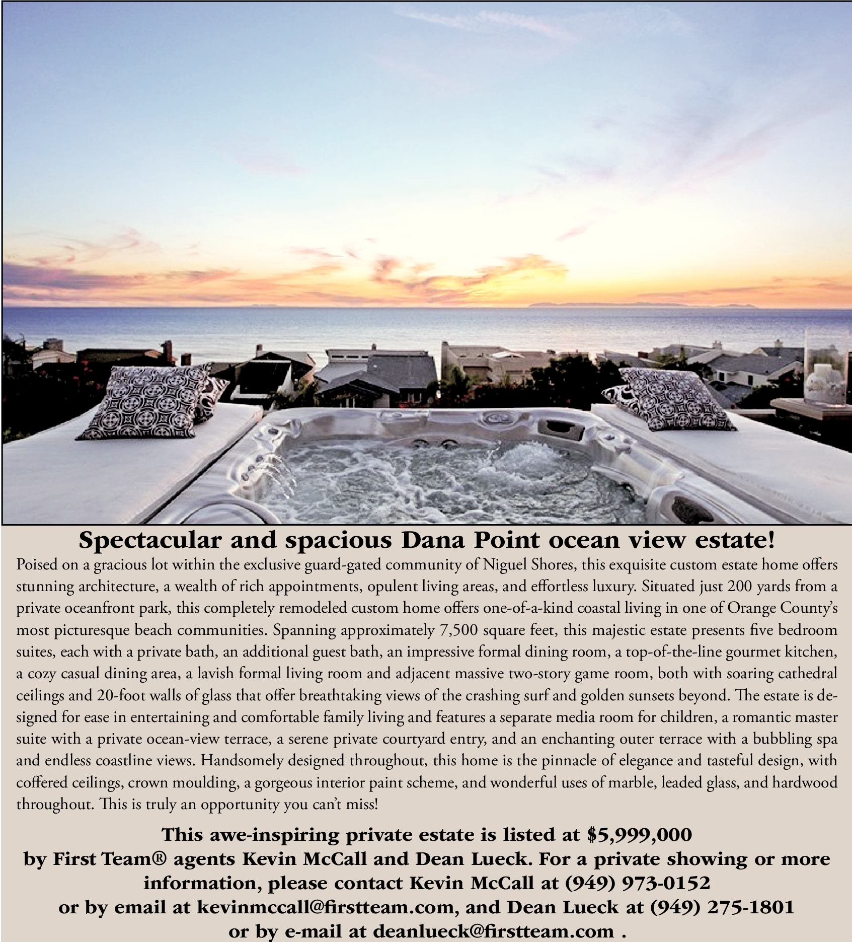 Spectacular and spacious Dana Point ocean view estate! Poised on a gracious lot within the exclusive guard-gated community of Niguel Shores, this exquisite custom estate home offers stunning architecture, a wealth of rich appointments, opulent living areas, and effortless luxury. Situated just 200 yards from a private oceanfront park, this completely remodeled custom home offers one-of-a-kind coastal living in one of Orange County’s most picturesque beach communities. Spanning approximately 7,500 square feet, this majestic estate presents five bedroom suites, each with a private bath, an additional guest bath, an impressive formal dining room, a top-of-the-line gourmet kitchen, a cozy casual dining area, a lavish formal living room and adjacent massive two-story game room, both with soaring cathedral ceilings and 20-foot walls of glass that offer breathtaking views of the crashing surf and golden sunsets beyond. The estate is designed for ease in entertaining and comfortable family living and features a separate media room for children, a romantic master suite with a private ocean-view terrace, a serene private courtyard entry, and an enchanting outer terrace with a bubbling spa and endless coastline views. Handsomely designed throughout, this home is the pinnacle of elegance and tasteful design, with coffered ceilings, crown moulding, a gorgeous interior paint scheme, and wonderful uses of marble, leaded glass, and hardwood throughout. This is truly an opportunity you can’t miss! This awe-inspiring private estate is listed at $5,999,000 by First Team® agents Kevin McCall and Dean Lueck. For a private showing or more information, please contact Kevin McCall at (949) 973-0152 or by email at kevinmccall@firstteam.com, and Dean Lueck at (949) 275-1801 or by e-mail at deanlueck@firstteam.com .