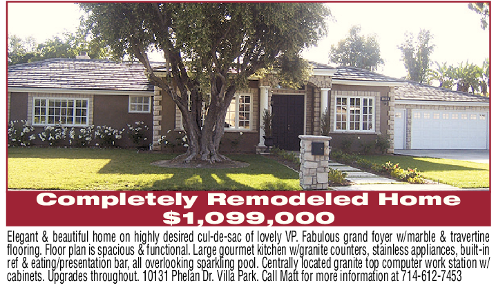 Completely Remodeled Home $1,099,000 Elegant & beautiful home on highly desired cul-de-sac of lovely VP. Fabulous grand foyer w/marble & travertine flooring. Floor plan is spacious & functional. Large gourmet kitchen w/granite counters, stainless appliances, built-in ref & eating/presentation bar, all overlooking sparkling pool. Centrally located granite top computer work station w/ cabinets. Upgrades throughout. 10131 Phelan Dr. Villa Park. Call Matt for more information at 714-612-7453