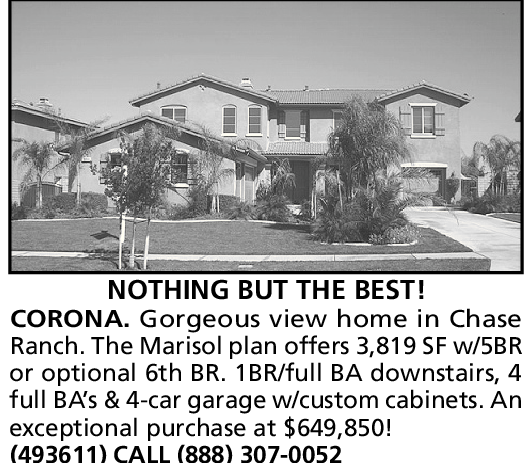 CORONA. Gorgeous view home in Chase Ranch. The Marisol plan offers 3,819 SF w/5BR or optional 6th BR. 1BR/full BA downstairs, 4 full BA’s & 4-car garage w/custom cabinets. An exceptional purchase at $649,850!